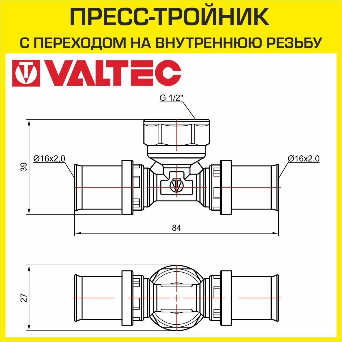 Тройник пресс с переходом на внутреннюю резьбу 16х1/2"х16 VALTEC VTm.232.N.160416