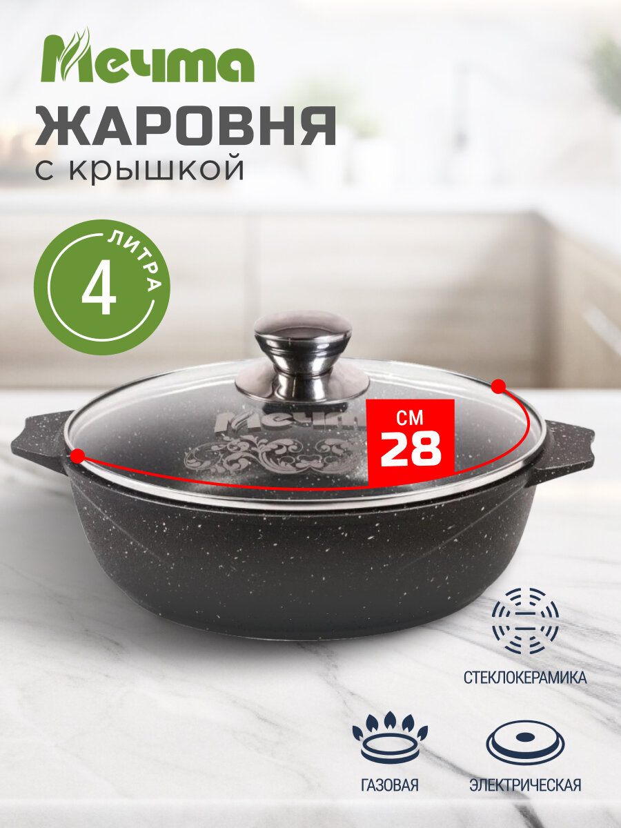 Жаровня алюминий, 30 см, антипригарное покрытие, Мечта, Гранит black, 35802, с крышкой
