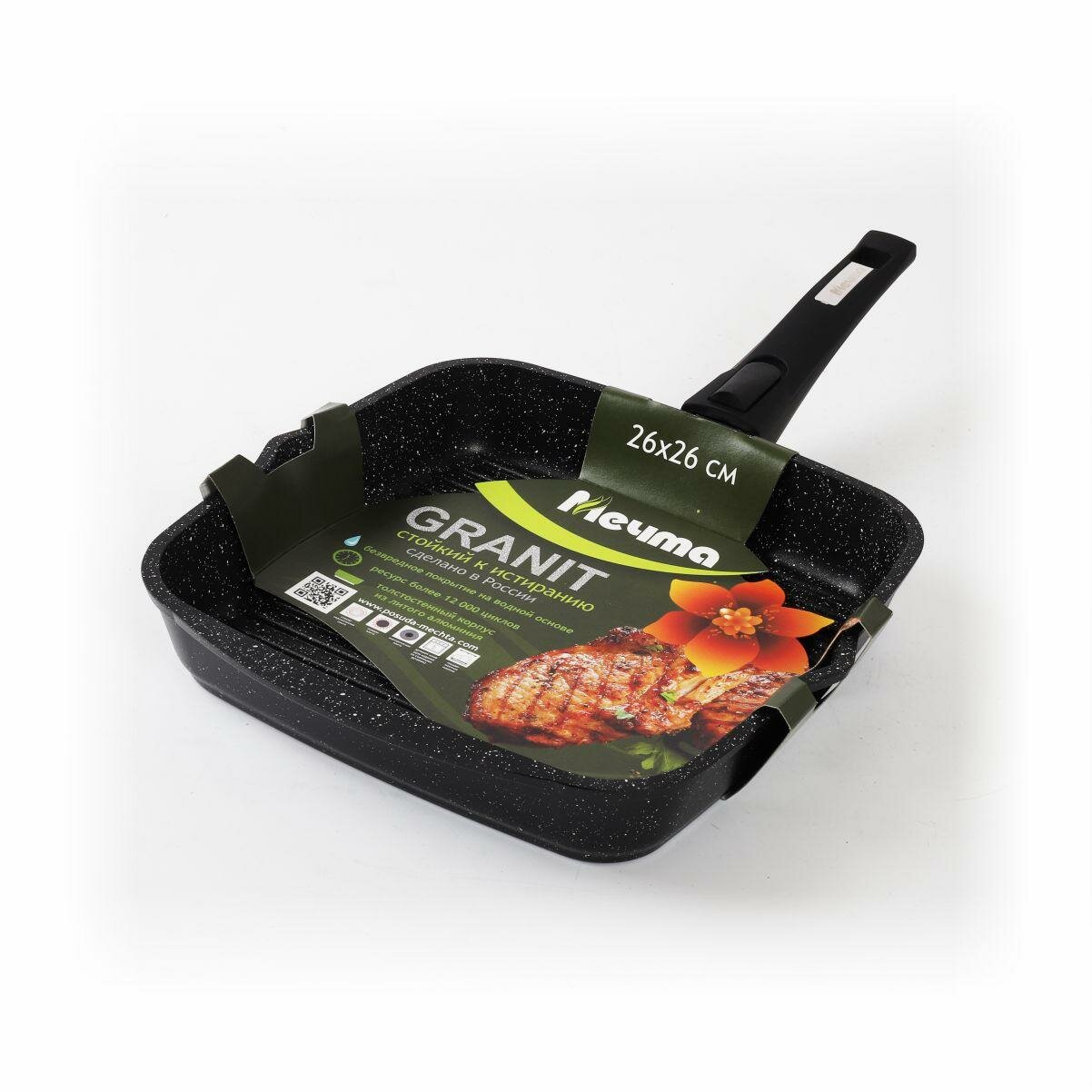 Сковорода гриль Мечта квадратная 28х28 см Гранит с антипригарным покрытием со съемной ручкой, НЕ индукционная