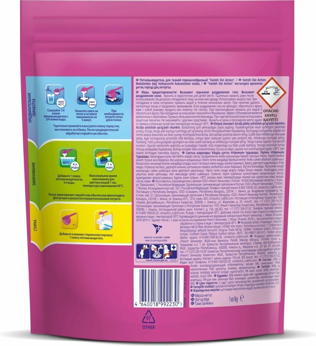 Vanish Oxi Action порошок Кислородный пятновыводитель для цветного белья и вещей, 1 кг