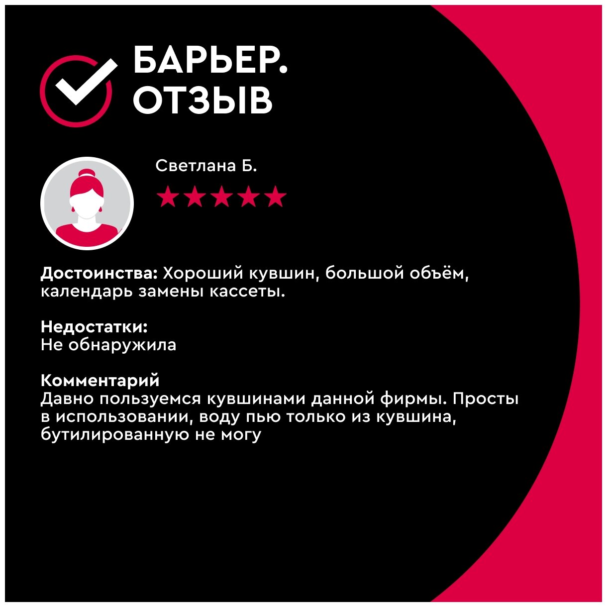 | Плюсы: | Доставка, качество товара. Покупаю не в первый раз Барьер. Доступность картриджей. |