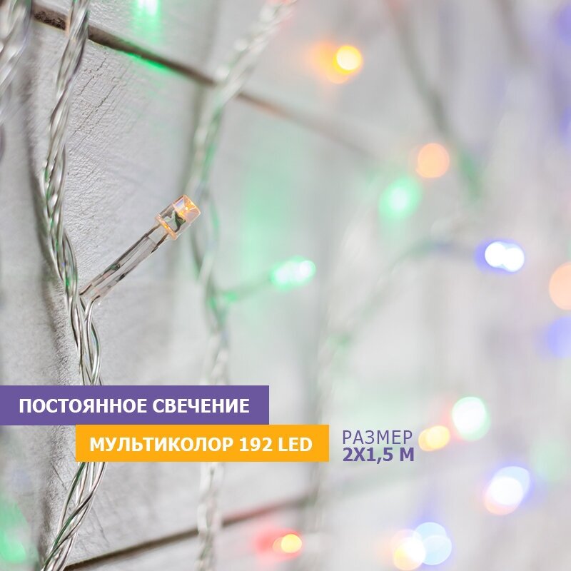 Гирлянда Светодиодный дождь 2х1,5м, постоянное свечение, прозрачный провод, 220В, диоды мульти, 192 LED