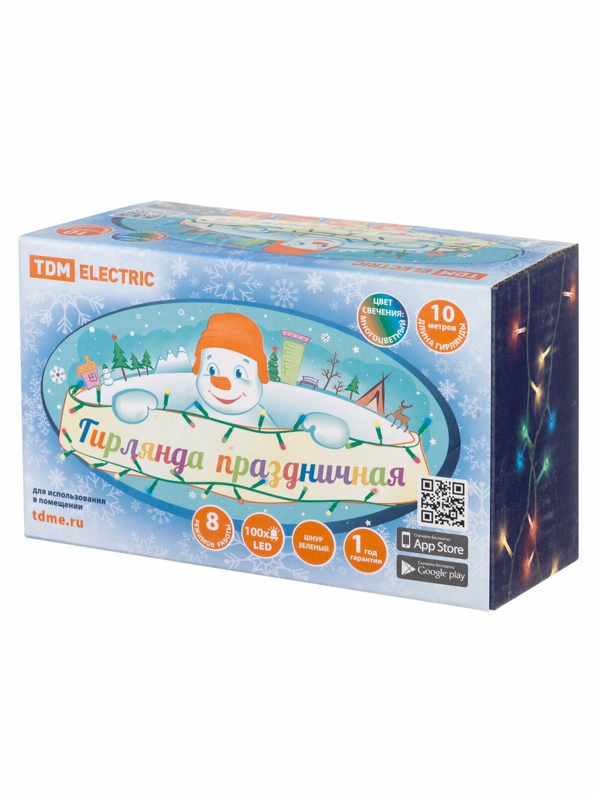 Светодиодная гирлянда TDM ELECTRIC светодиодная СГ100MЗ10, многоцвет., зеленый шнур, 10м, 8 режимов, 250 В