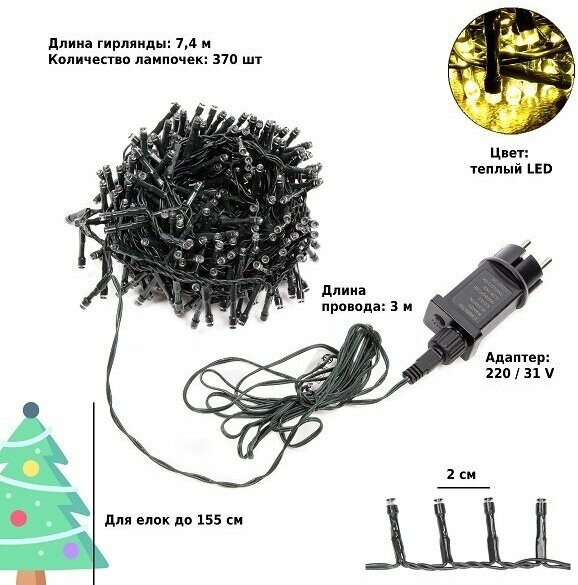 Гирлянда новогодняя электрическая на елку 7,4 метров для дома и для улицы, 370 лампочек, теплый белый свет