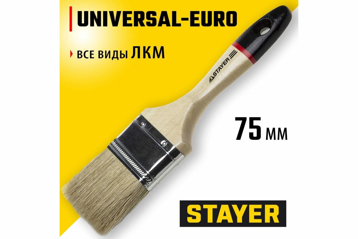 STAYER UNIVERSAL - EURO, 75 мм, 3″, светлая натуральная щетина, деревянная ручка, все виды ЛКМ, плоская кисть (0102-075)