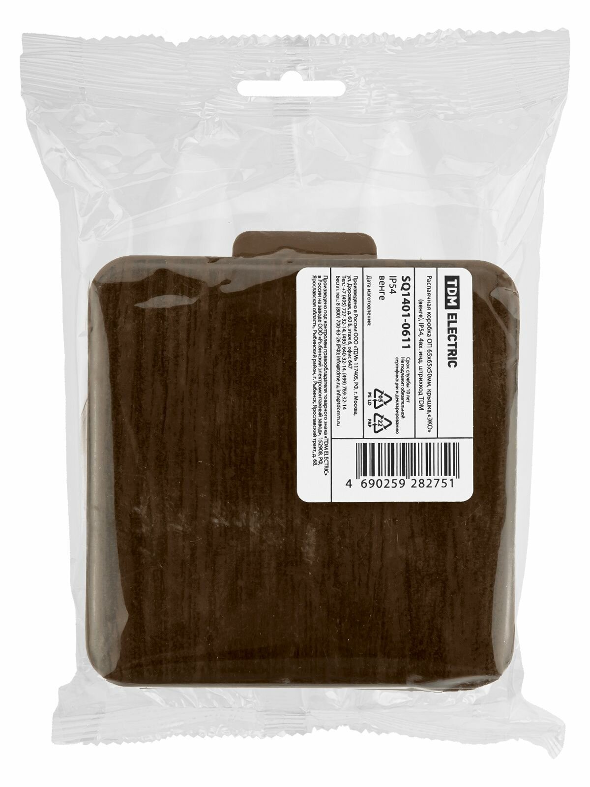 Распаячная коробка ОП 65х65х50мм, крышка, ЭКО (венге), IP54, 4вх. инд. штрихкод TDM