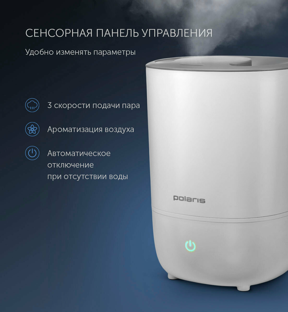 Увлажнитель воздуха Polaris PUH 7240 TF, мощность 30 Вт., объем 5 л., верхний залив воды, площадь 40 кв.м., белый/голубой