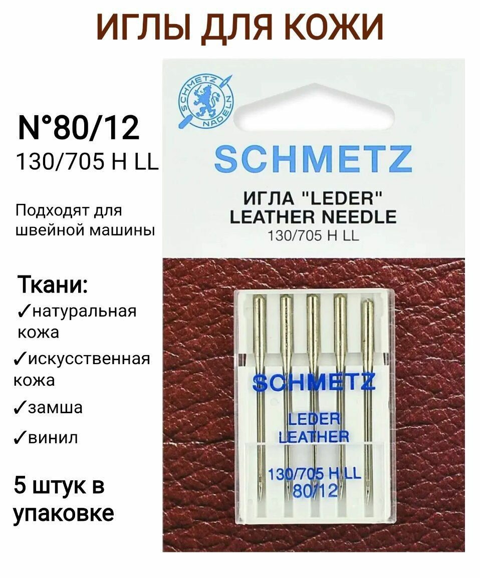 Игла/иглы Schmetz Leather 130/705 H LL 80/12, серебристый, 5 шт.