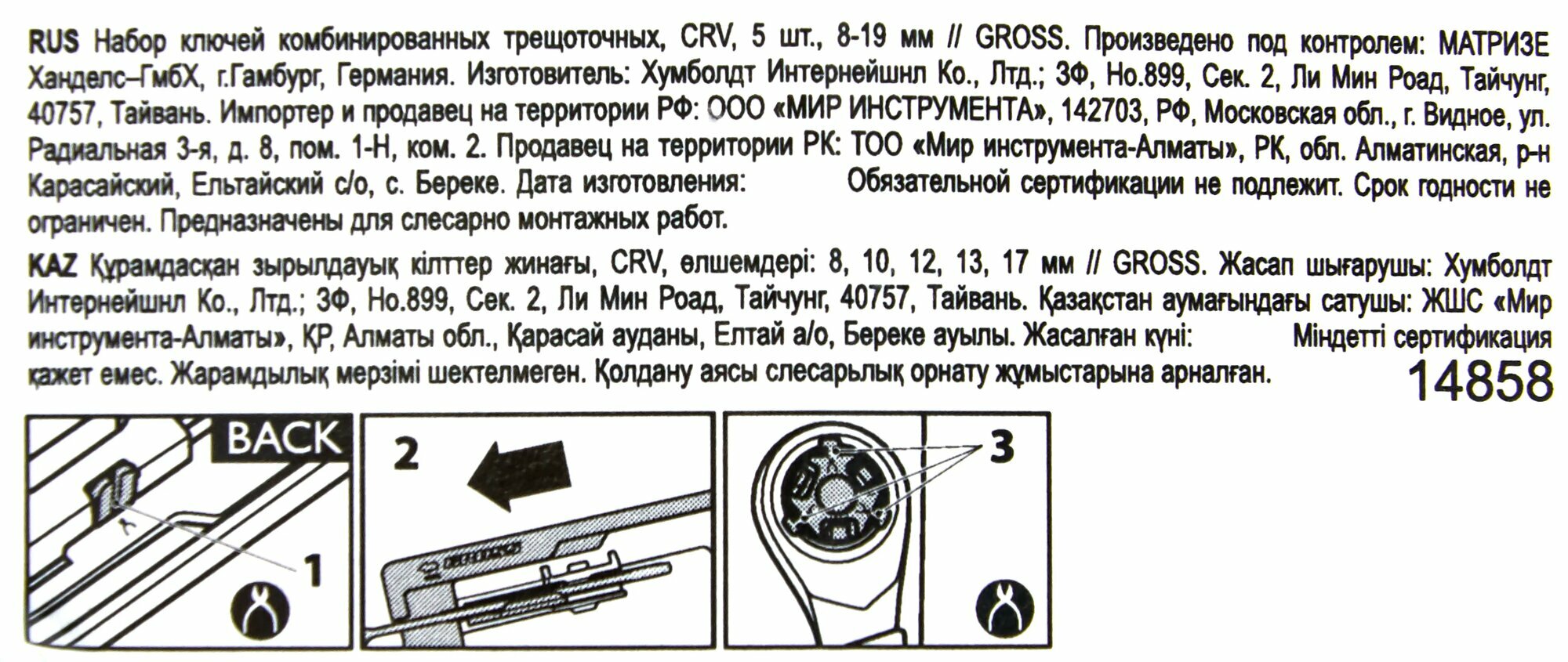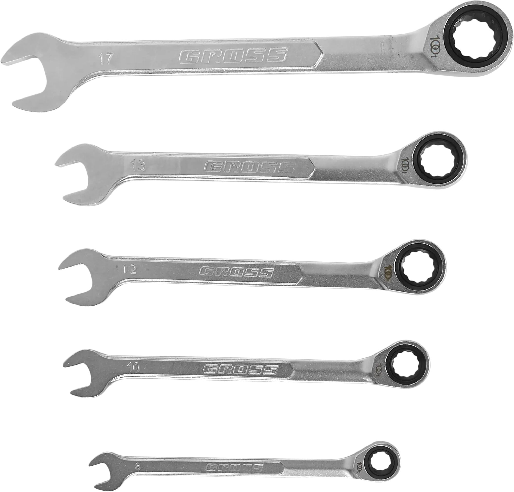 GROSS Набор ключей комбинированных трещоточных, количество зубьев 100, СRV, 5 шт, 8- 17 мм Gross, ( 14858 )