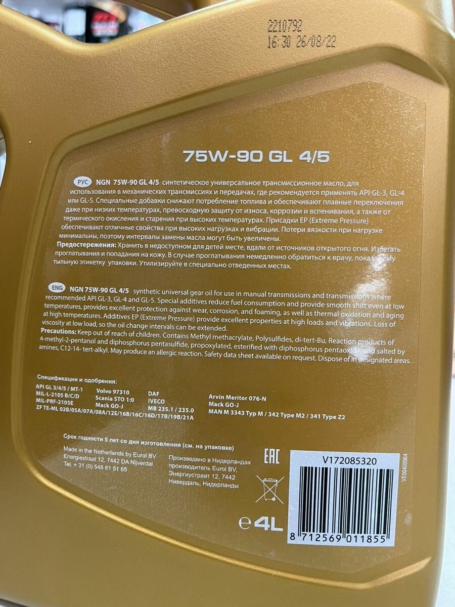 Масло Трансмиссионное Ngn Gl4/5 75w-90 Синтетическое 4 Л V172085320 NGN арт. V172085320