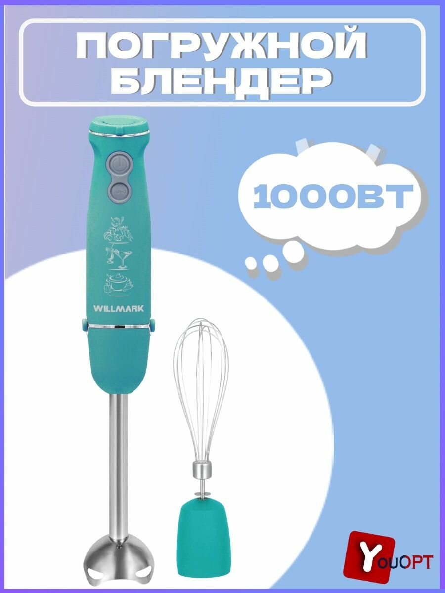 Блендер погружной WILLMARK WHB-1110BS, 1000 Вт, турборежим, плавная регулировка скорости, бирюзовый