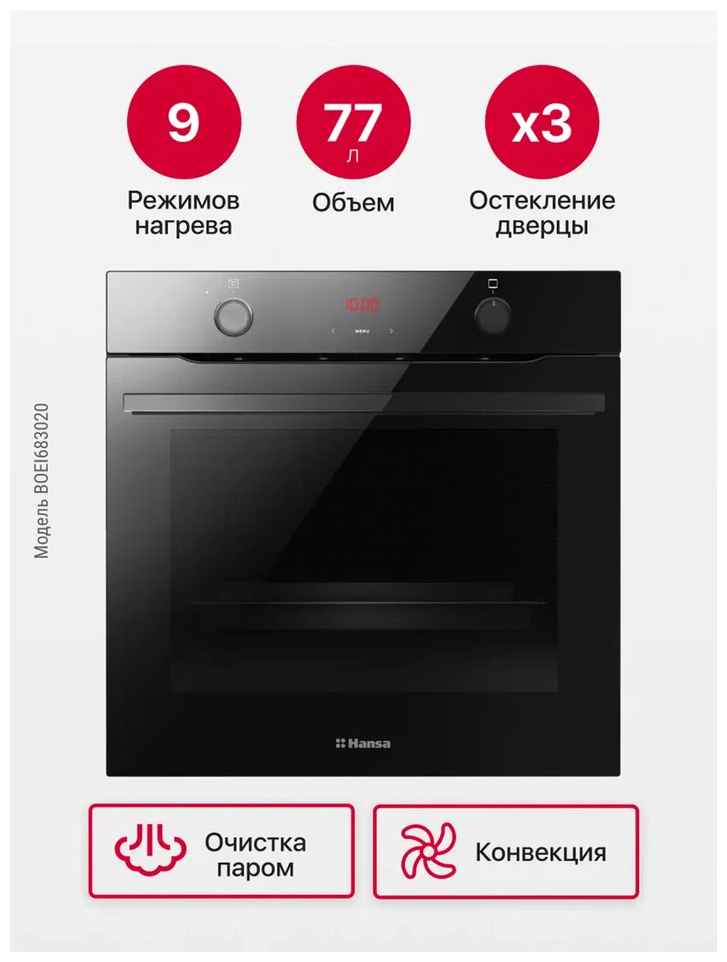 Электрический духовой шкаф Hansa BOES683020, встраиваемый, 60 см, 77 л, 9 режимов, с дисплеем, таймером, конвекцией, грилем, быстрым нагревом, телескопическими направляющими, черный
