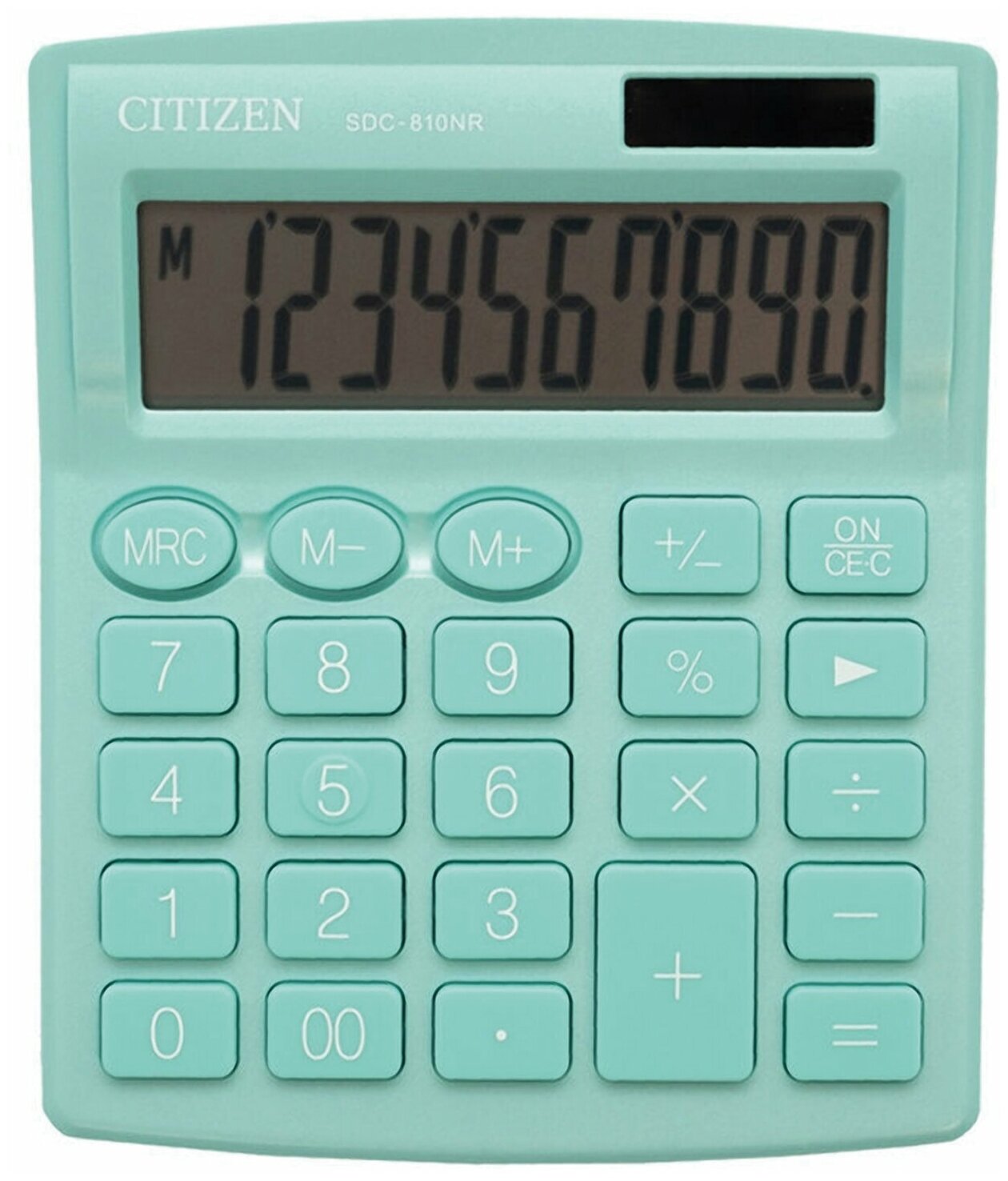 Калькулятор настольный Citizen SDC-810NR-GN, 10 разрядов, двойное питание, 102*124*25мм, бирюзовый И 4560196212558
