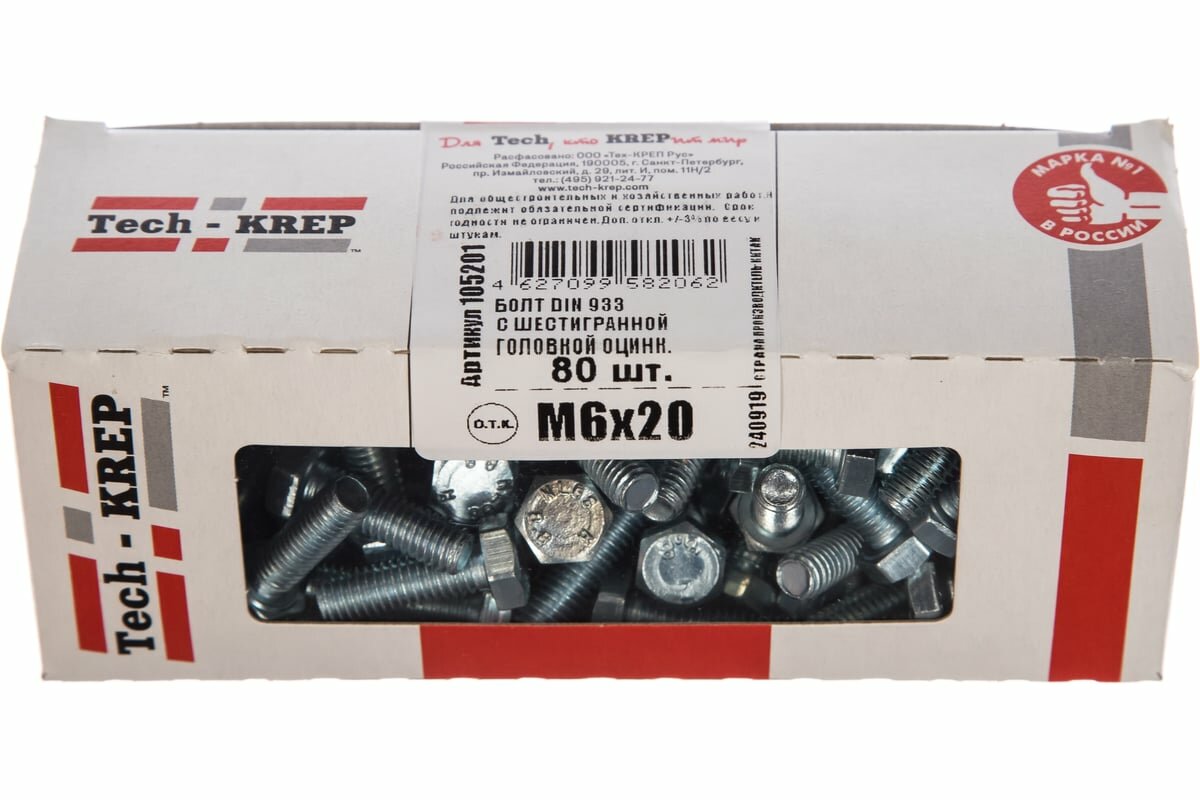 Tech-Krep Болт DIN933 с шестигранной головкой оцинк. М6x20 80 шт - коробка с ок. Tech-Kr 105201