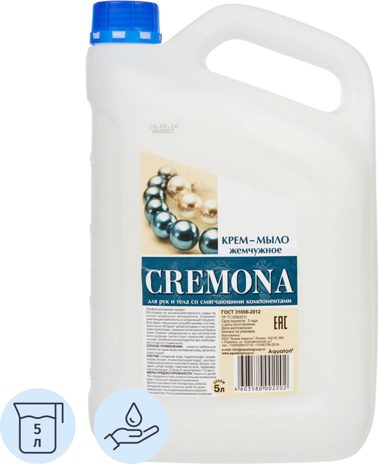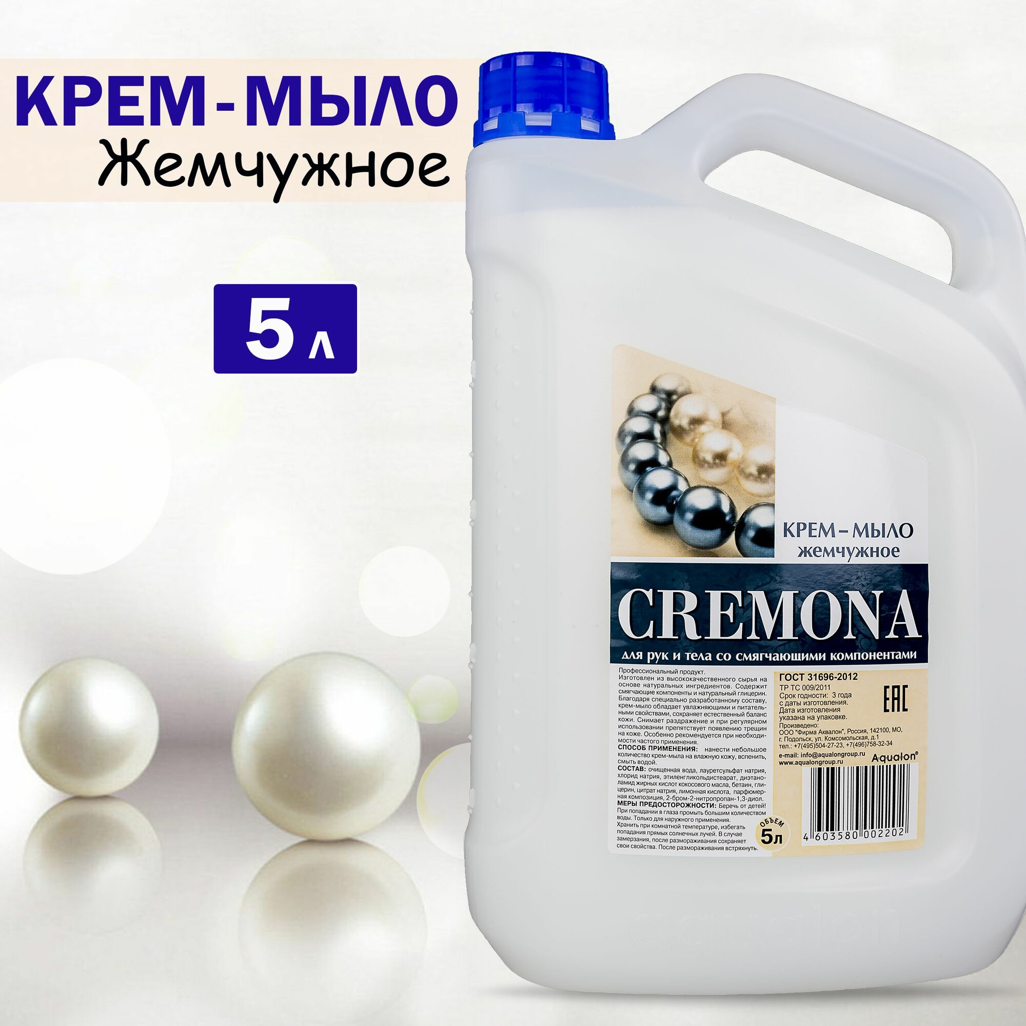 Мыло-крем жидкое 5 л кремона "Жемчужное", премиум, перламутровое, из натуральных компонентов, 102202, 605718