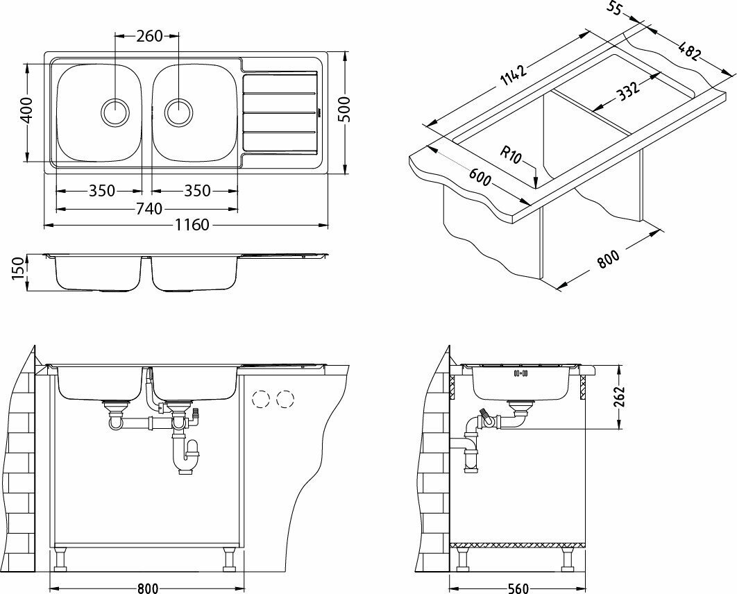 Кухонная мойка ALVEUS LINE 100 NAT-90 1160X500 2X нерж.сталь (1087978)