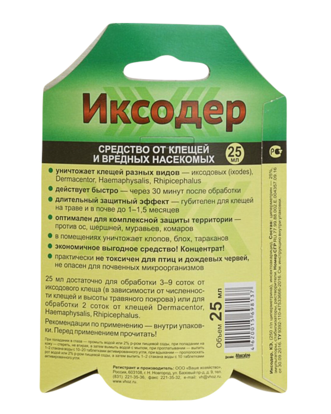 Иксодер 25мл. От клещей/муравьев/тараканов/блох/клопов (обраб. террит.) циперметрин Ваше Хозяйство (арт. 729755)