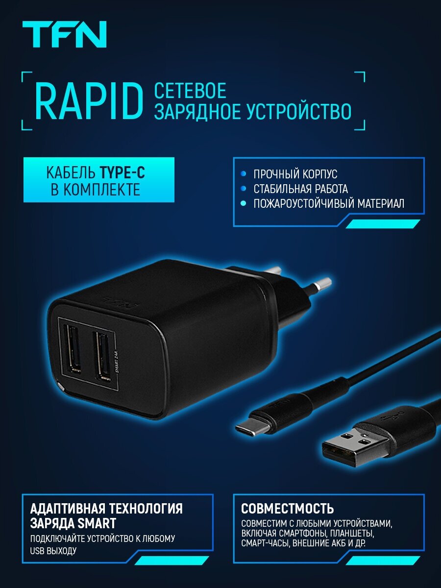 Сетевое зарядное устройство TFN RAPID + 12ВТ, 2.4A, 2 USB, кабель TYPE-C (TFN-WCRPD12W2U03) черный