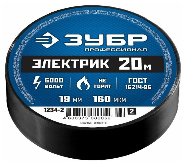 Купить Изолента ПВХ ЗУБР Электрик-20 не поддерживает горение, 20м 0,16x19мм, черная 1234-2_z02