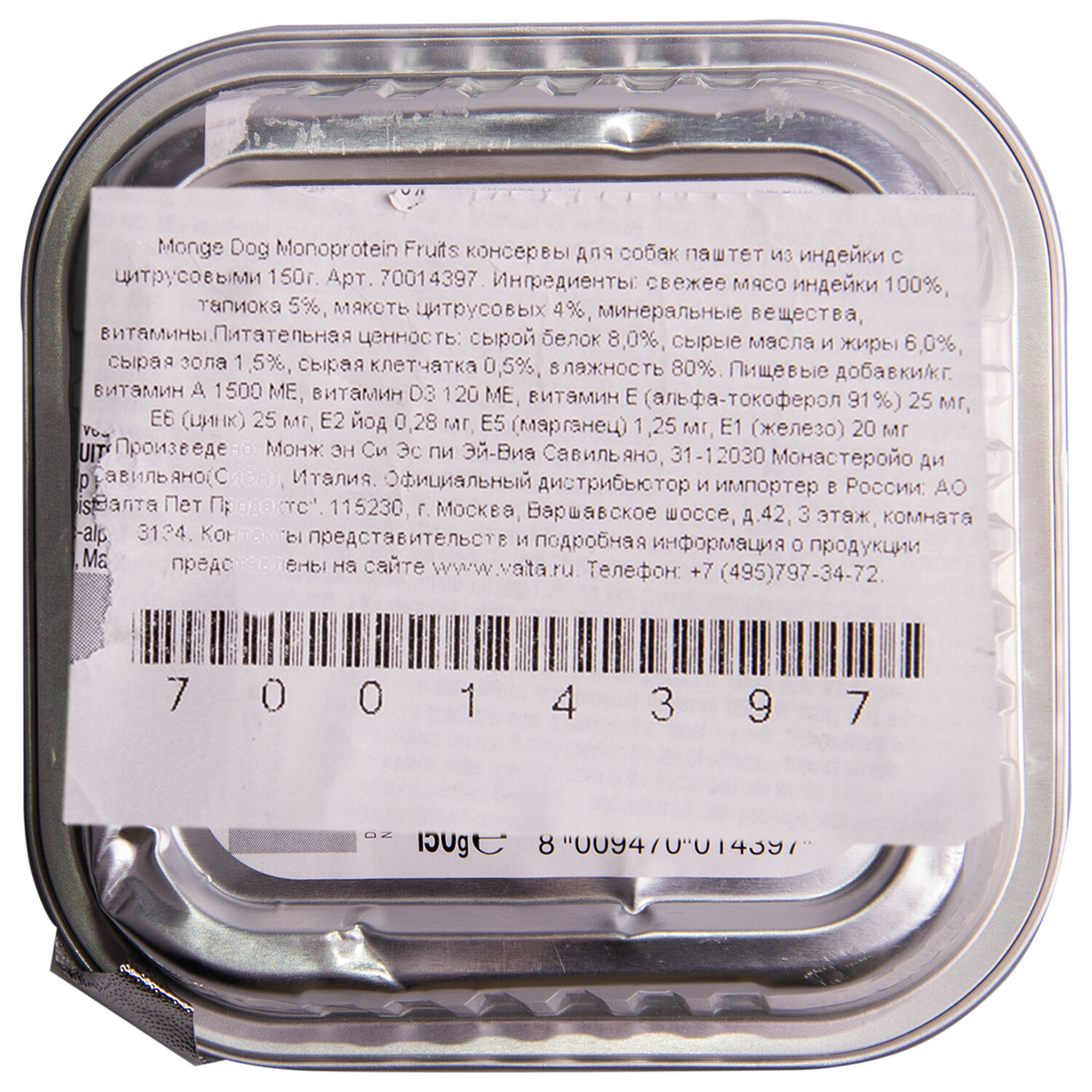 Влажный корм Monge Dog Natural Monoprotein Fruits для собак, паштет из индейки с цитрусовыми, консервы 150 г