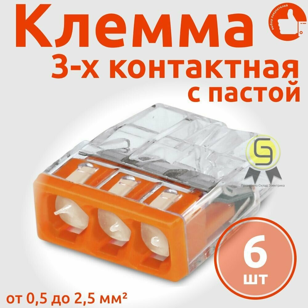 Клеммник самозажимной для 3-х проводников 0.5- 2.5мм2 с пастой (Wago), арт. 2273-243