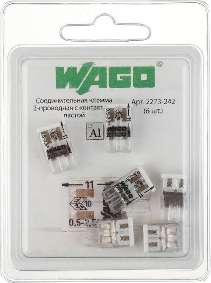 Купить Клемма 2х(0.5-2.5мм) 2-х проводн. для распред. короб. (с контактн. пастой "Alu-Plus") WAGO 2273-242 ( упак.6шт.)