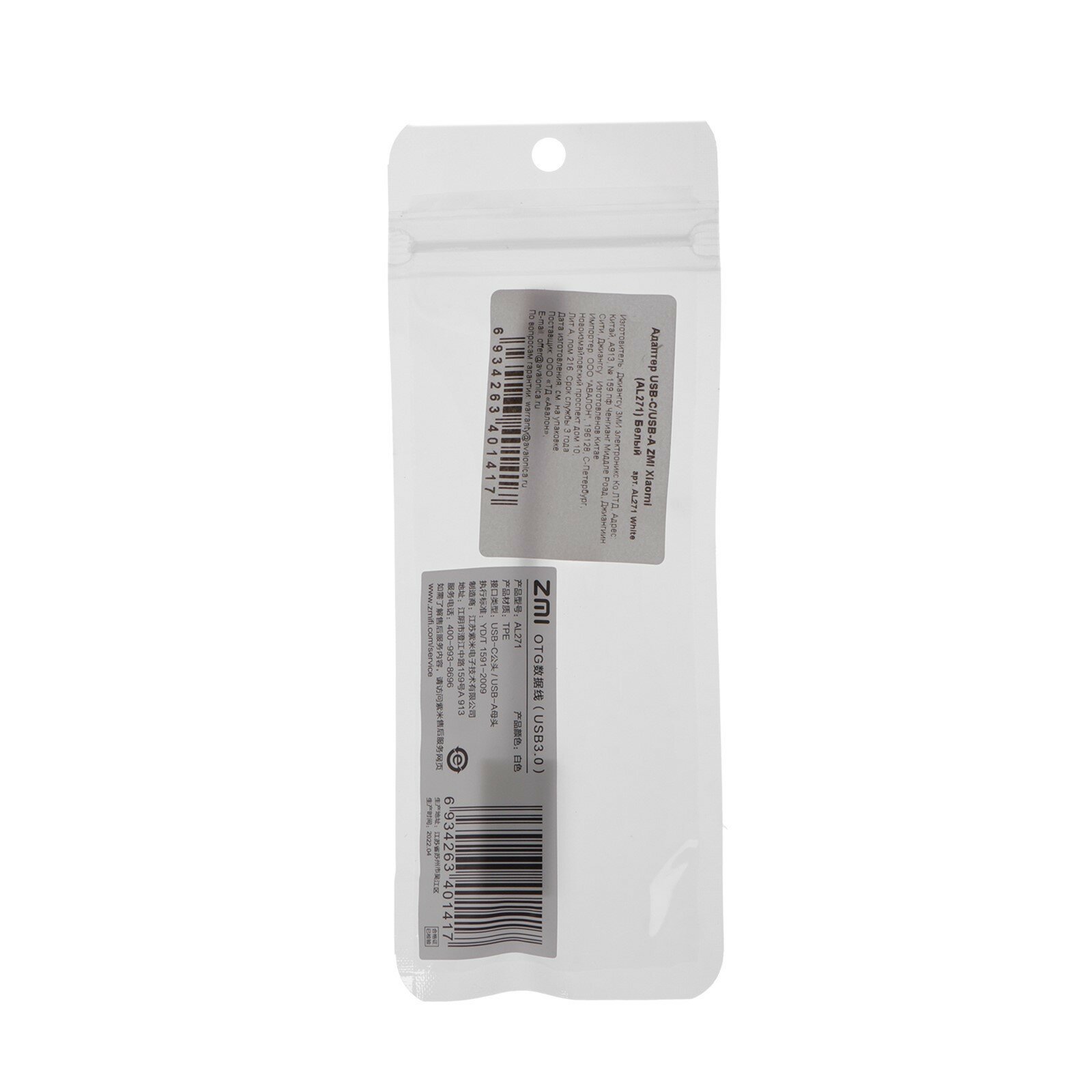 Переходник ZMI AL271, USB Type-C (m) - USB (f), 0.03м, белый [al271 white]