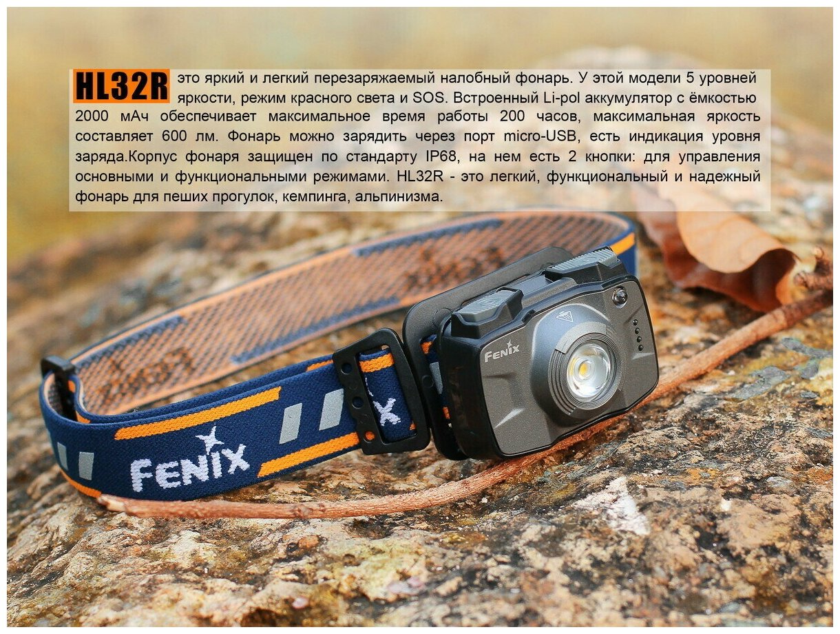Фонарь светодиодный налобный Fenix Hl32r серый, 600 лм, встроенный аккумулятор HL32Rg .