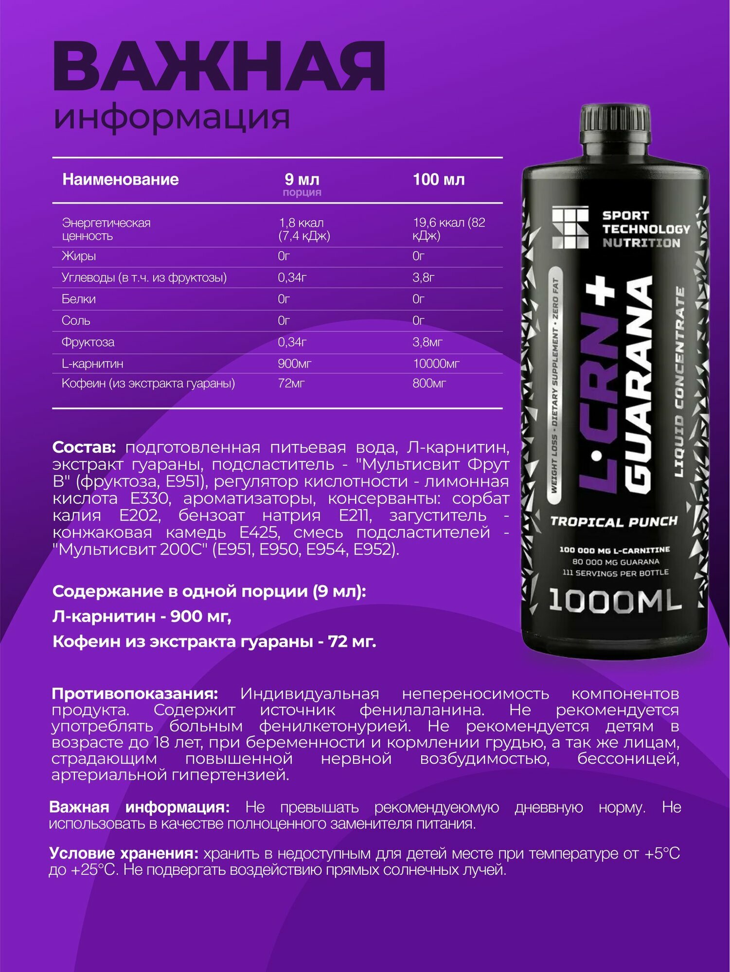 СохранитьL- карнитин и гуарана SPORTTECH L-Carnitine + Guarana Liquid Concentrate, тропический пунш, 1000 мл. Кофеин интересное: