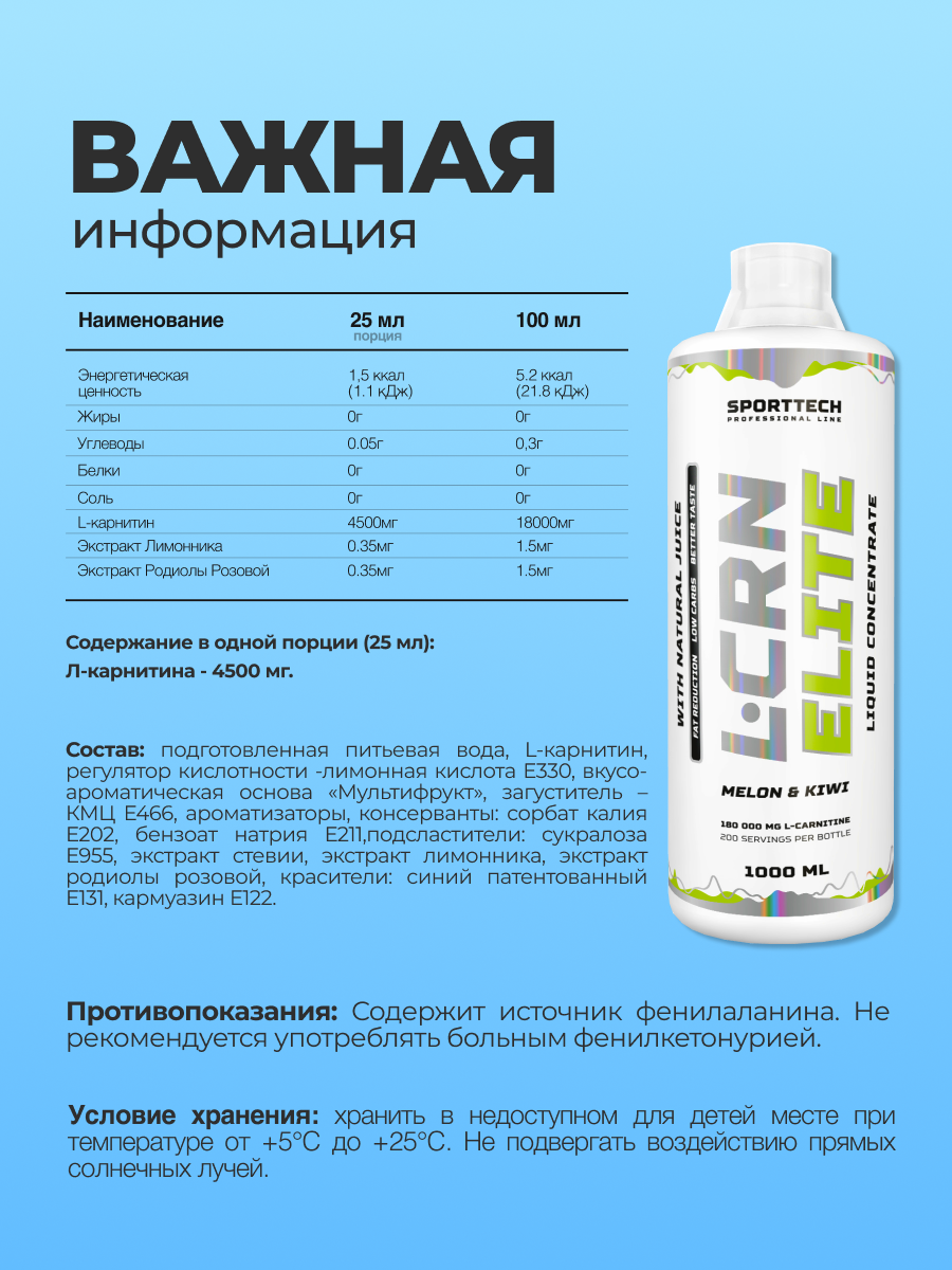 СохранитьL- карнитин SPORTTECH L-CRN Elite, дыня-киви, 1000 мл. интересное: