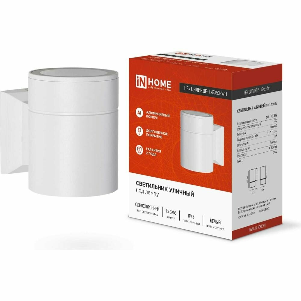 IN HOME 4690612023502 Светильник НБУ ЦИЛИНДР-1xGX53-WH 16Вт IP65 230В уличный настенный односторонний алюм. под лампу 1хGX53 бел. IN HOME 4690612023502