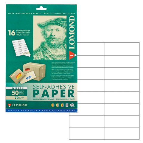 Самоклеящаяся бумага Lomond A4, белая, 16 делений (105 x 37 мм), 70 г/м2, для этикеток, 50 листов (2100125)