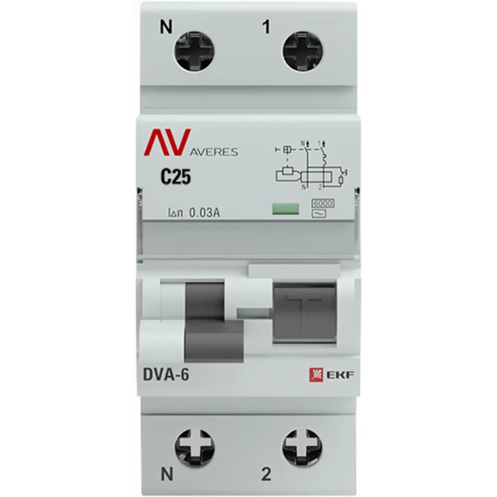 Выключатель автоматический дифференциального тока 2п (1P+N) C 25А 30мА тип A 6кА DVA-6 Averes | код. rcbo6-1pn-25C-30-a-av | EKF ( 1шт. )