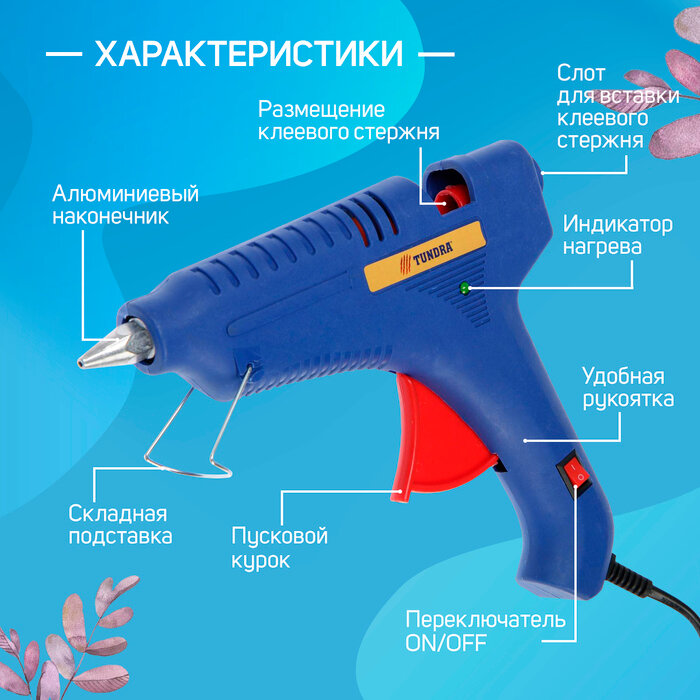 Клеевой пистолет TUNDRA, 60 Вт, 220 В, шнур 1.2 м, выключатель, индикатор, антикапля, 11 мм TUNDRA 4