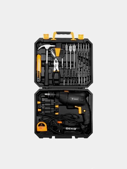 Дрель ударная сетевая Deko DKID600W в пластиковом кейсе набор инструментов 40 предметов черно-желтый
