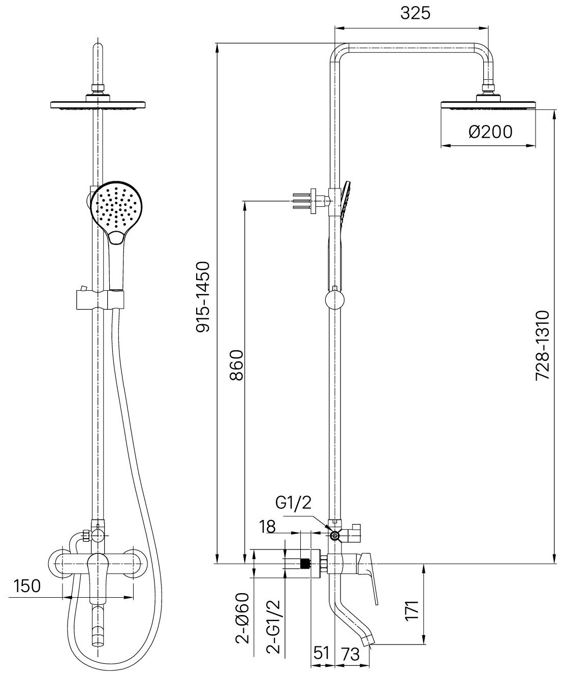 | Высота стойки для душа | 1450 мм |