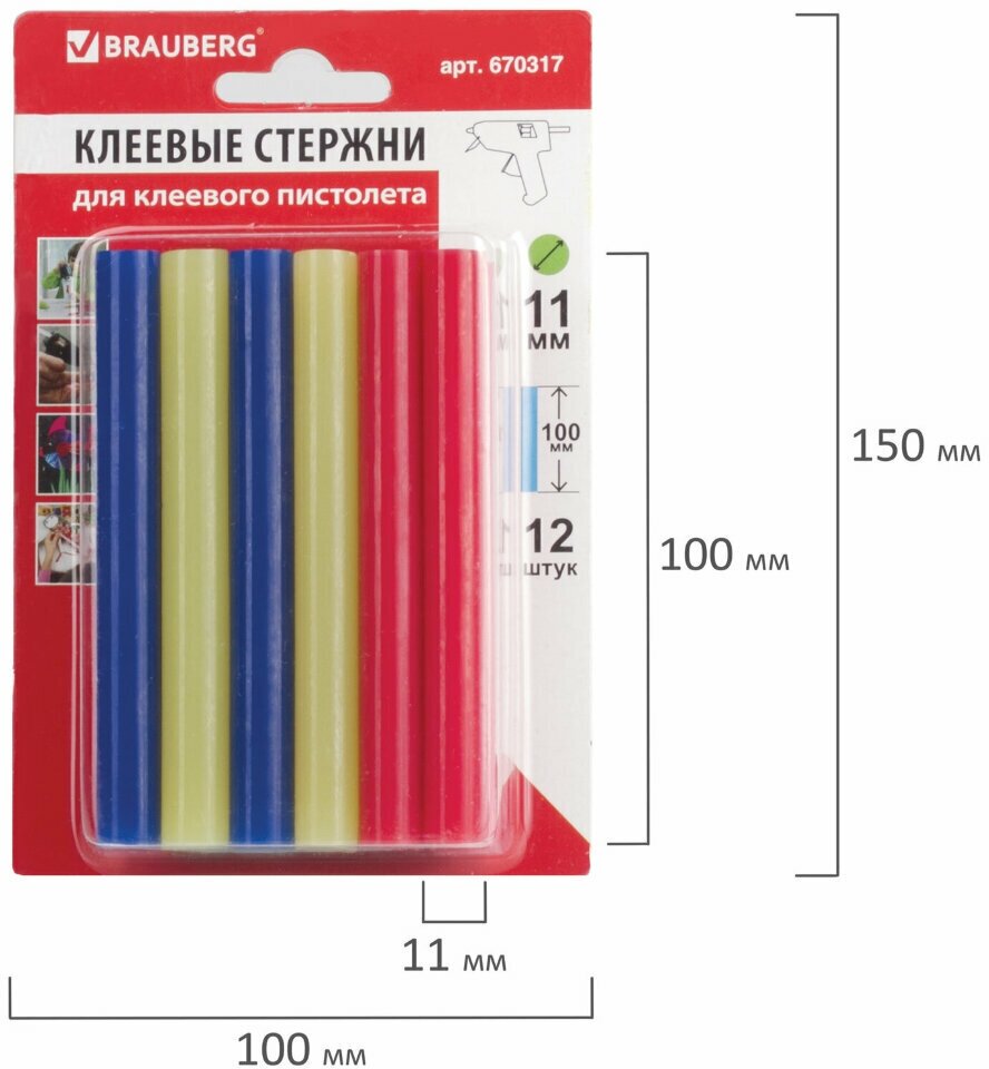 Клеевые стержни, комплект 12 шт., диаметр 11 мм, длина 100 мм, цветные (ассорти), 6 цветов, BRAUBERG, блистер, 670317