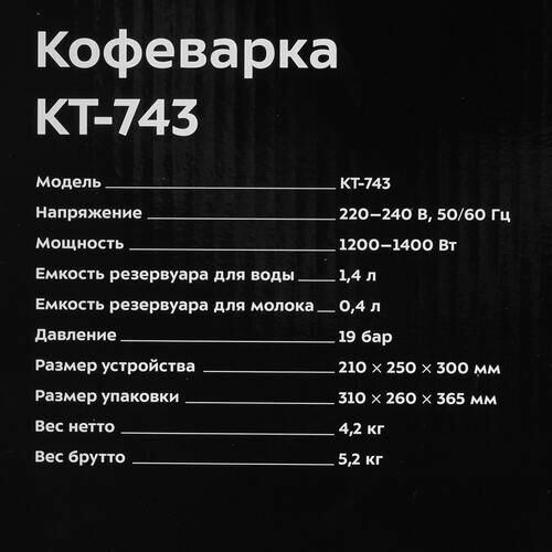 | Отзыв: | Кофеварка KT-743 компактное устройство, с необходимым набором функций, для приготовления ароматного кофе. Можно насладиться прекрасным латте или эспрессо, совершенно не выходя из дома.