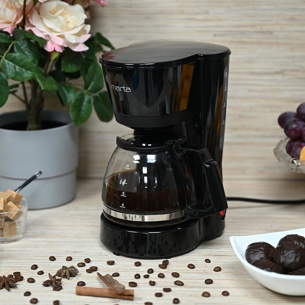 Давно мечтала о недорогой кофеварке. Модель капельная MARTA MT-2117 меня сразу впечатлила. Стильно выглядит, красивый дизайн и аккуратно сделана. Пользоваться просто и удобно, никаких сложностей. Резервуара воды вполне хватает, 8-10 чашек. Благодаря технологии заваривания получается очень вкусный ароматный кофе. Готовится достаточно быстро. Есть функция подогрева, а это тоже большой плюс. Рекомендую!!!