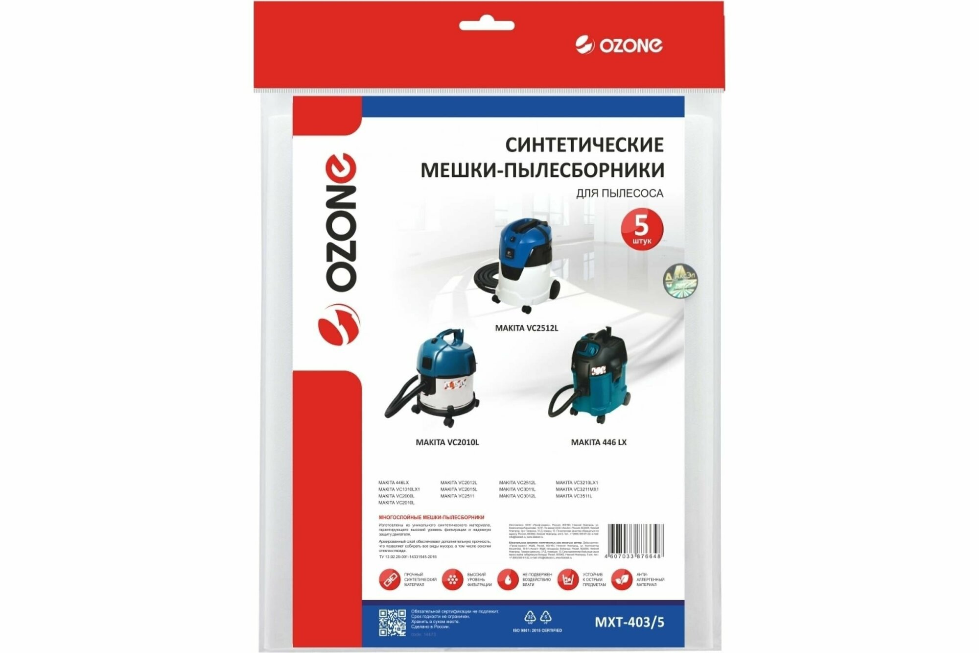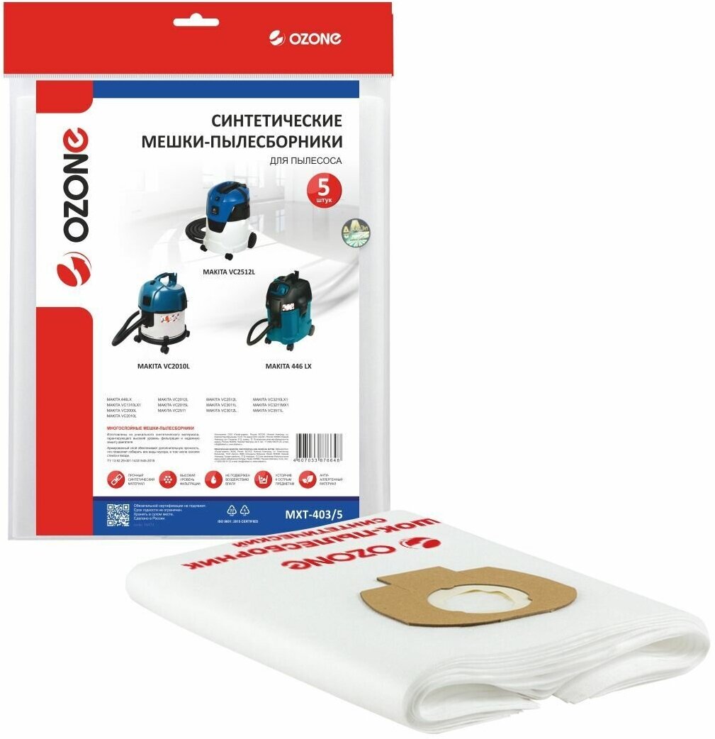 Мешки для пылесоса MAKITA VC2012L VC2512L 5шт. синтетические не боятся мокрой пыли бренд. OZONE арт. MXT-403/5