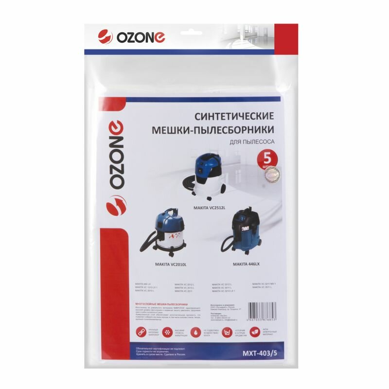 Мешки для пылесоса MAKITA VC2012L, VC2512L, 5шт., синтетические, не боятся мокрой пыли, бренд. OZONE, арт. MXT-403/5