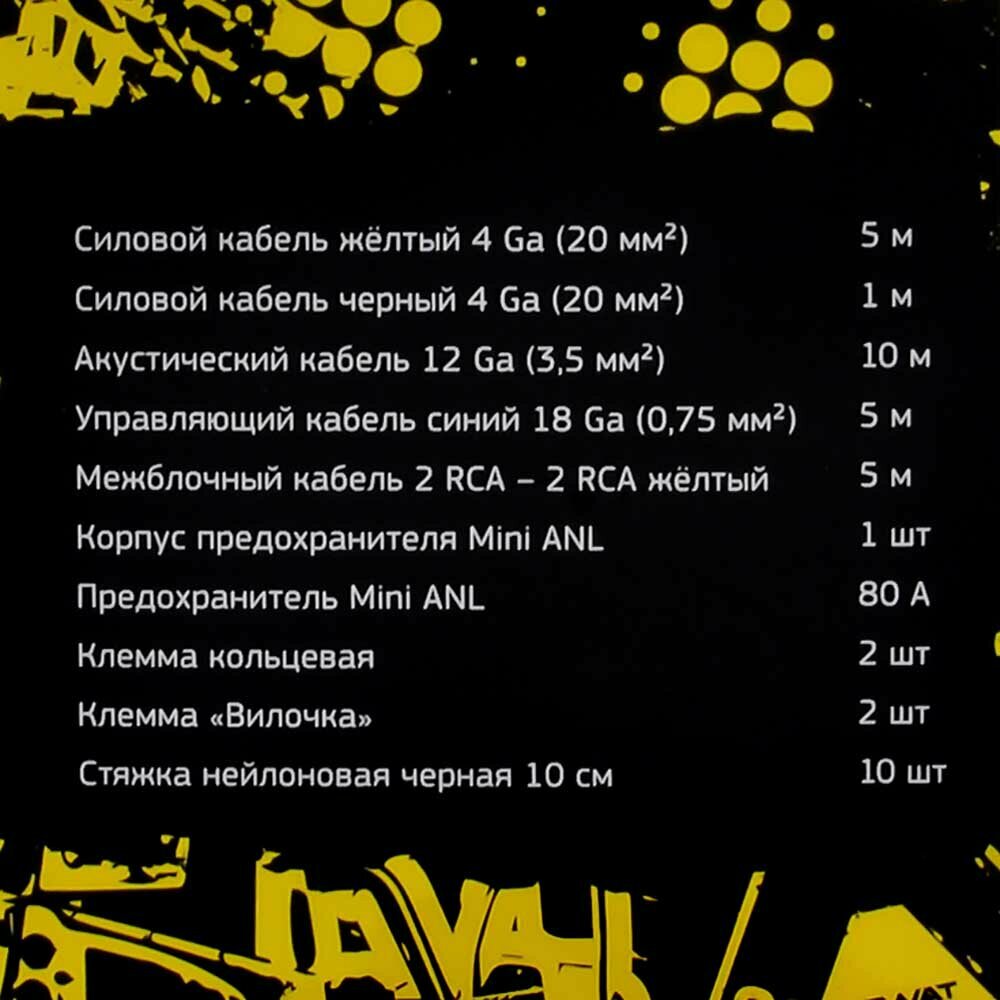 | Комплектация | силовой кабель, желтый, CCA 4 AWG (20 мм2 ) 5 метров; силовой кабель, черный, CCA 4 AWG (20 мм2 ) 1 метр; акустический кабель, желтый-черный, ССА 12 AWG (3,5 мм2 ) 10 метров; межблочный кабель (RCA), витая пара, ССА 2 RCA – 2 RCA, желтый, 5 метров - 1 шт.; управляющий кабель (remote), ССA, синий 18 AWG, (0,75 мм2 ) 5 метров; колба с предохранителем miniANL 80A; клемма силовая «кольцо» - 2 шт. (1 красная, 1 черная) ; клемма силовая «вилочка» - 2 шт.(1 красная, 1 черная) ; стяжка нейлоновая черная, 10см - 10 шт |