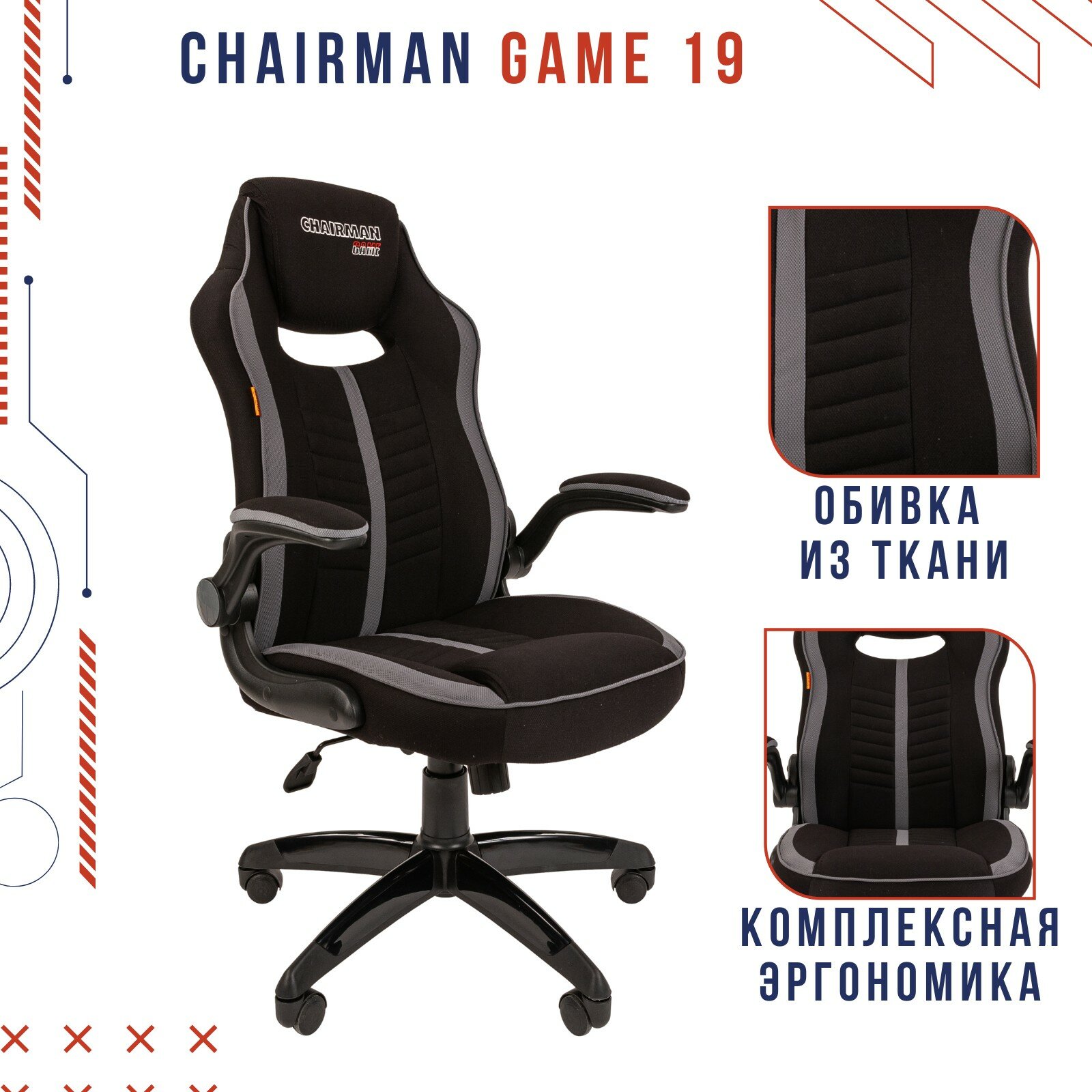 Игровое компьютерное кресло с откидными подлокотниками CHAIRMAN GAME 19, ткань, черный/серый