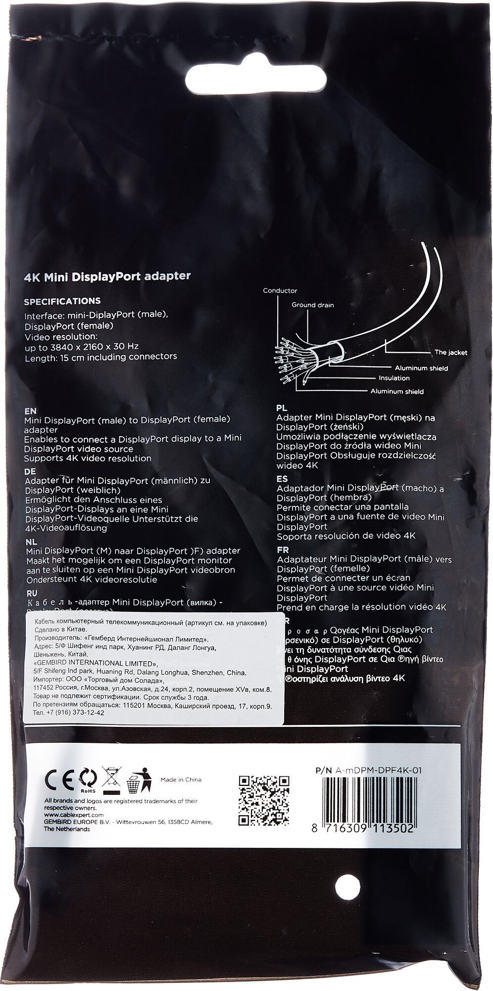 Переходник miniDisplayPort -> DisplayPort, Cablexpert A-mDPM-DPF4K-01,4K, 20M/20F, длина 16 см, черный