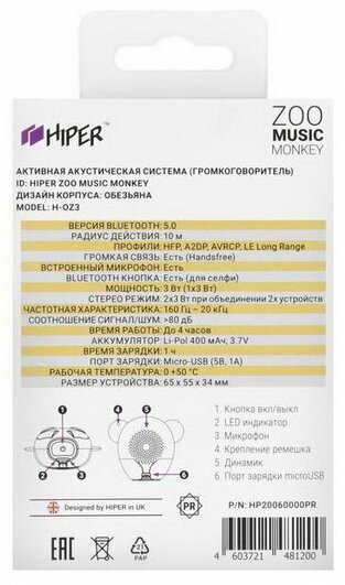 Активная акустическая система HIPER ZOO Music Monkey, H-OZ3, 3 ВТ,160 Гц - 20 кГц,80 dB,400 мАч,BT 5,0, Micro-USB