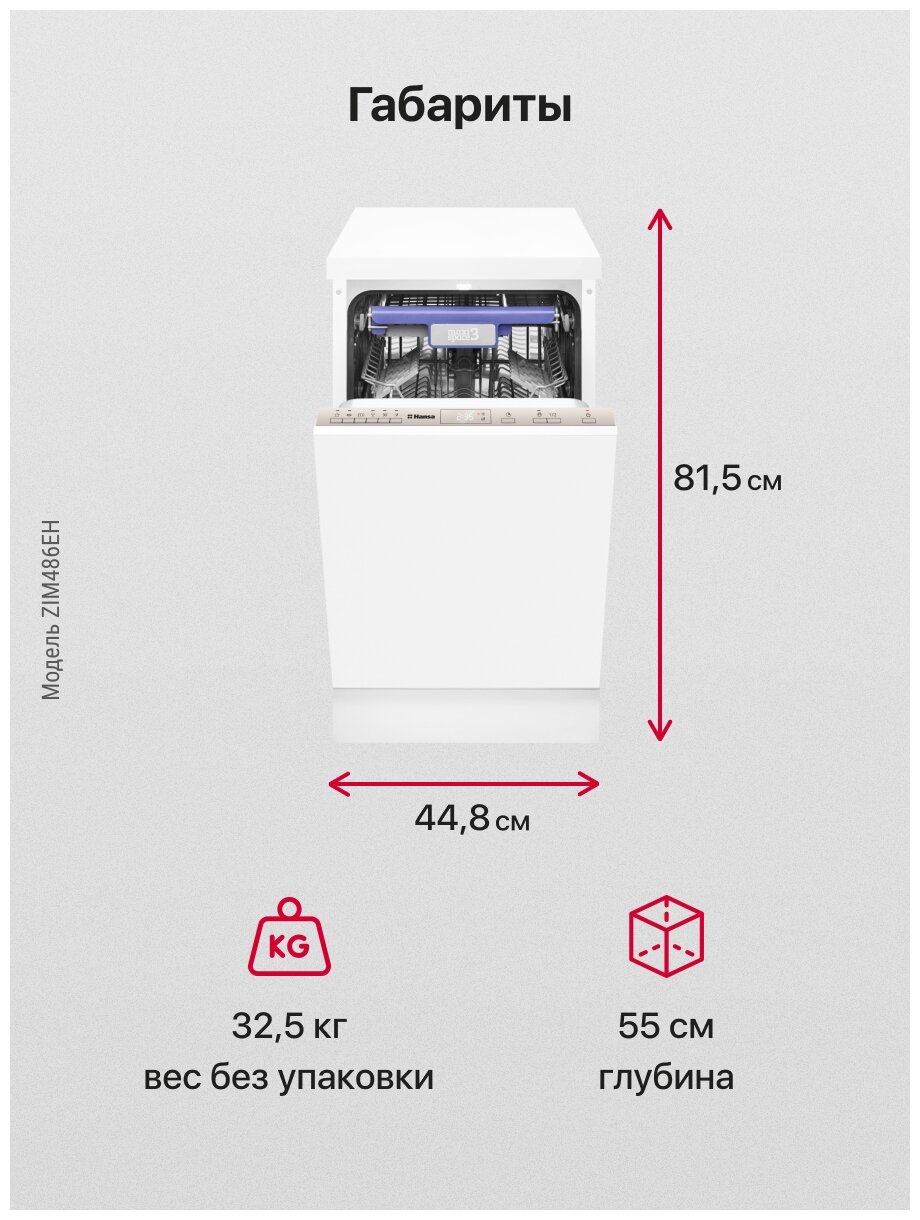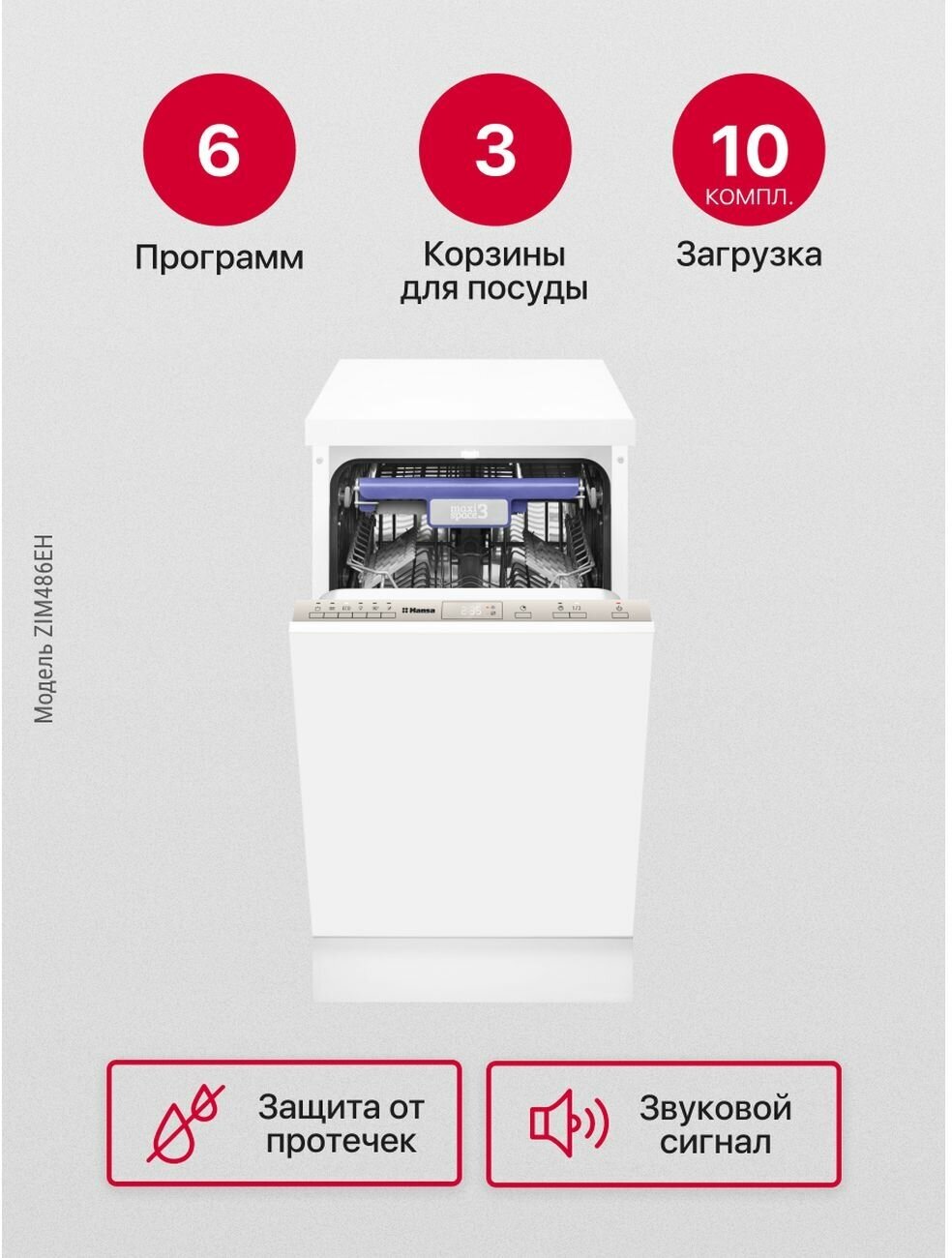 Встраиваемая посудомоечная машина Hansa ZIM486EH, 45 см, компактная, с защитой от протечек, 6 программ, с 3 корзинами, с режимом половинной загрузки