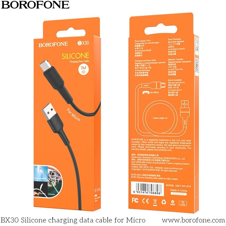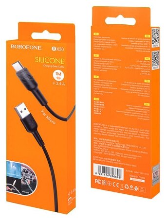 USB кабель BOROFONE BX30 Silicone MicroUSB, 2,4A, 1м, силикон (черный), шт BX30