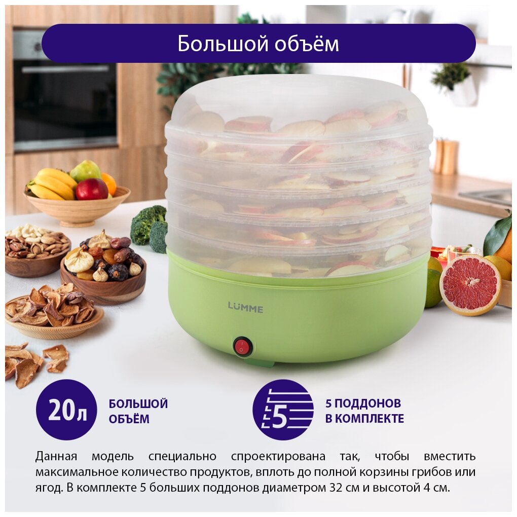 Сушилка для овощей и фруктов Lumme Lfd-105pp зеленый нефрит 200W 5 съемных поддонов, объем 20л, под .