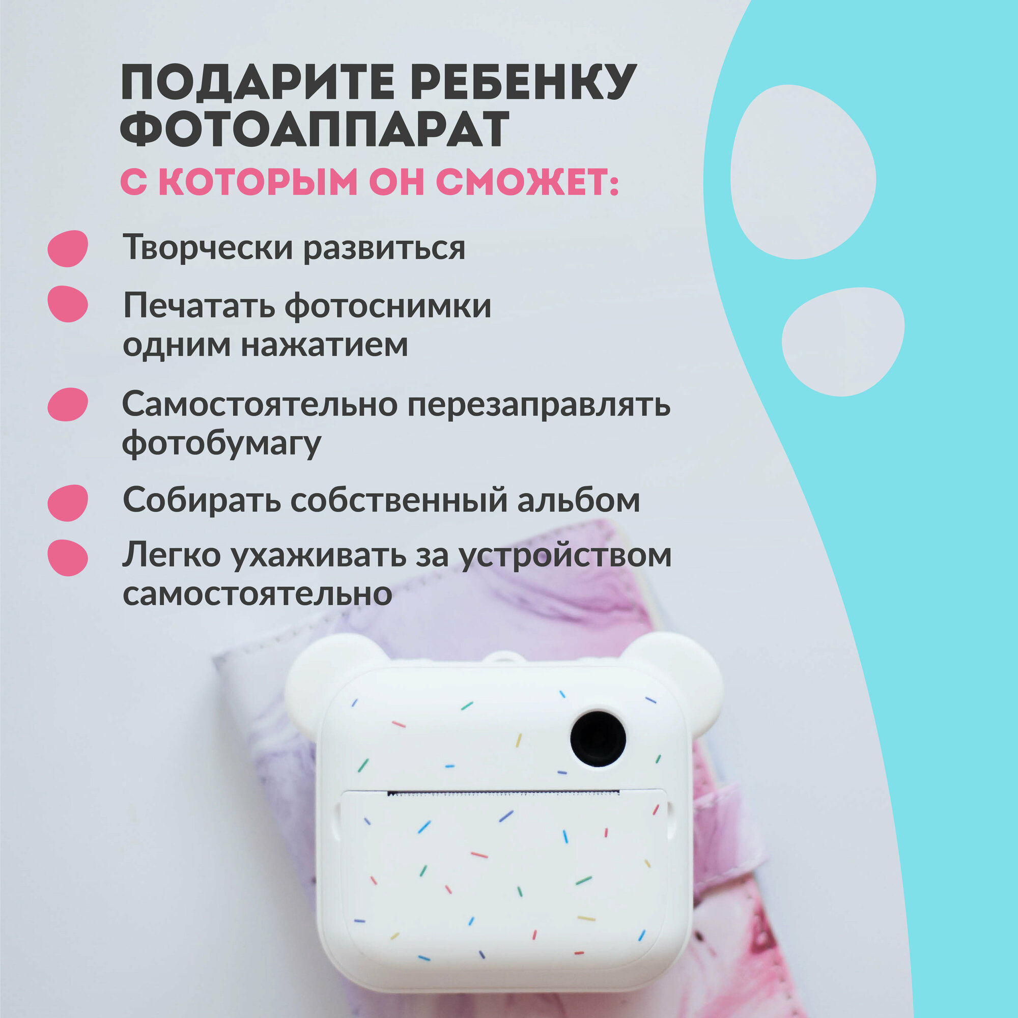 Покупал племяннице, но в итоге игрался сам не меньше. Выгодно отличается от полароида/инстакса тем, что фотки сохраняются на карту и их: 1) Можно напечатать в нескольких экземплярах. 2) Можно не печатать, если не нравится и не тратить лишнюю ленту. |