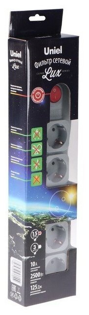 Купить Uniel Сетевой фильтр Uniel Lux, 5 розеток, 1.5 м, 10 А, 2500 Вт, ПВС 3х0.75, с з/к, с выкл., серый